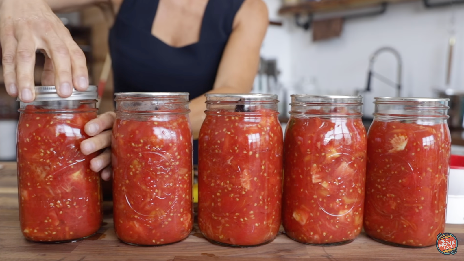 Sealing the canned tomatoes Talking about sealing, once all your beautiful tomatoes have been jarred gently place the jars back into the hot water for 60 minutes. This is the part of the process where the tomatoes will cook a little bit more. The tomato will become vibrant in color, sweeter in taste, and the jars will properly seal so that you are able to store these until you need them! Do a quick check. When you touch the top of your jar is there a bounce back? If there is a bounce back/popping noise leave them in the pot for another 15 minutes before checking again. Once they come out without a popping noise then they are perfect. Congratulations, you have finished making your own batch of jarred tomatoes! You can pull them out, let them cool down, and store them on a shelf or you can even be an old school nonna and hide them in your closet!